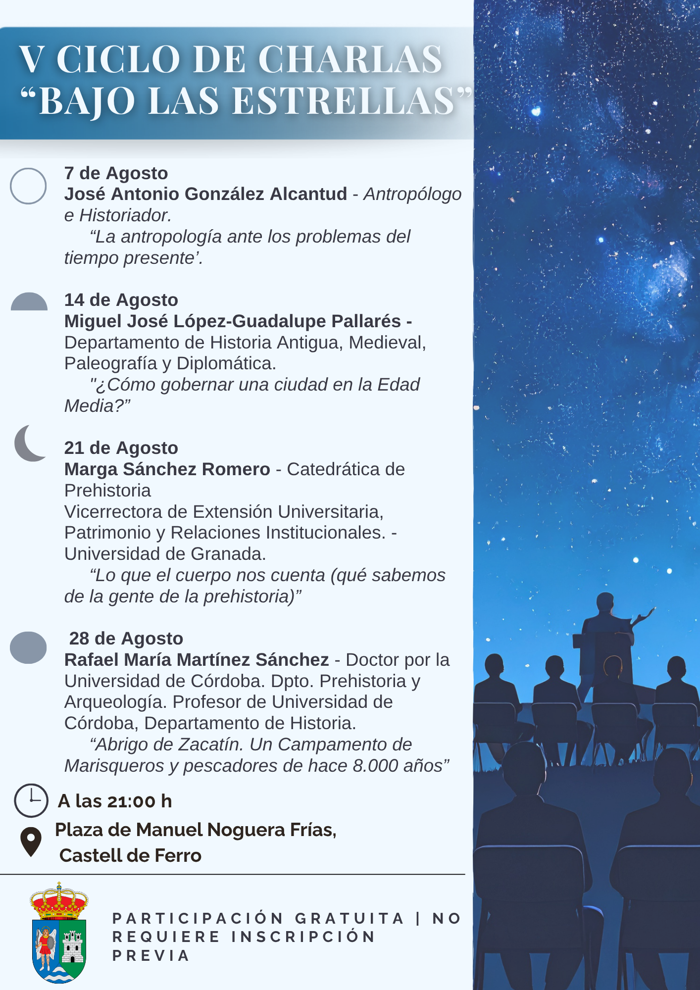 ¡Este agosto, vive la historia bajo las estrellas! Ven al V Ciclo de Charlas en Castell de Ferro y disfruta de cuatro noches mágicas en la Plaza de Manuel Noguera Frías, donde expertos en historia, arqueología y antropología te harán viajar al pasado con charlas fascinantes. ¡Te esperamos!
